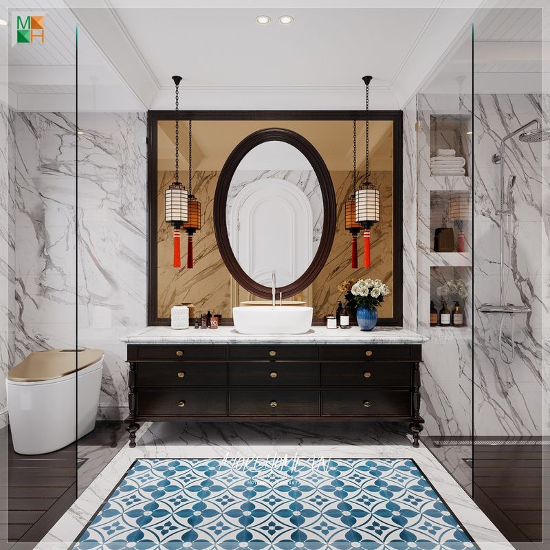 Kiểu dáng Indochine của mẫu thiết kế phòng tắm luôn gây ấn tượng với người nhìn.